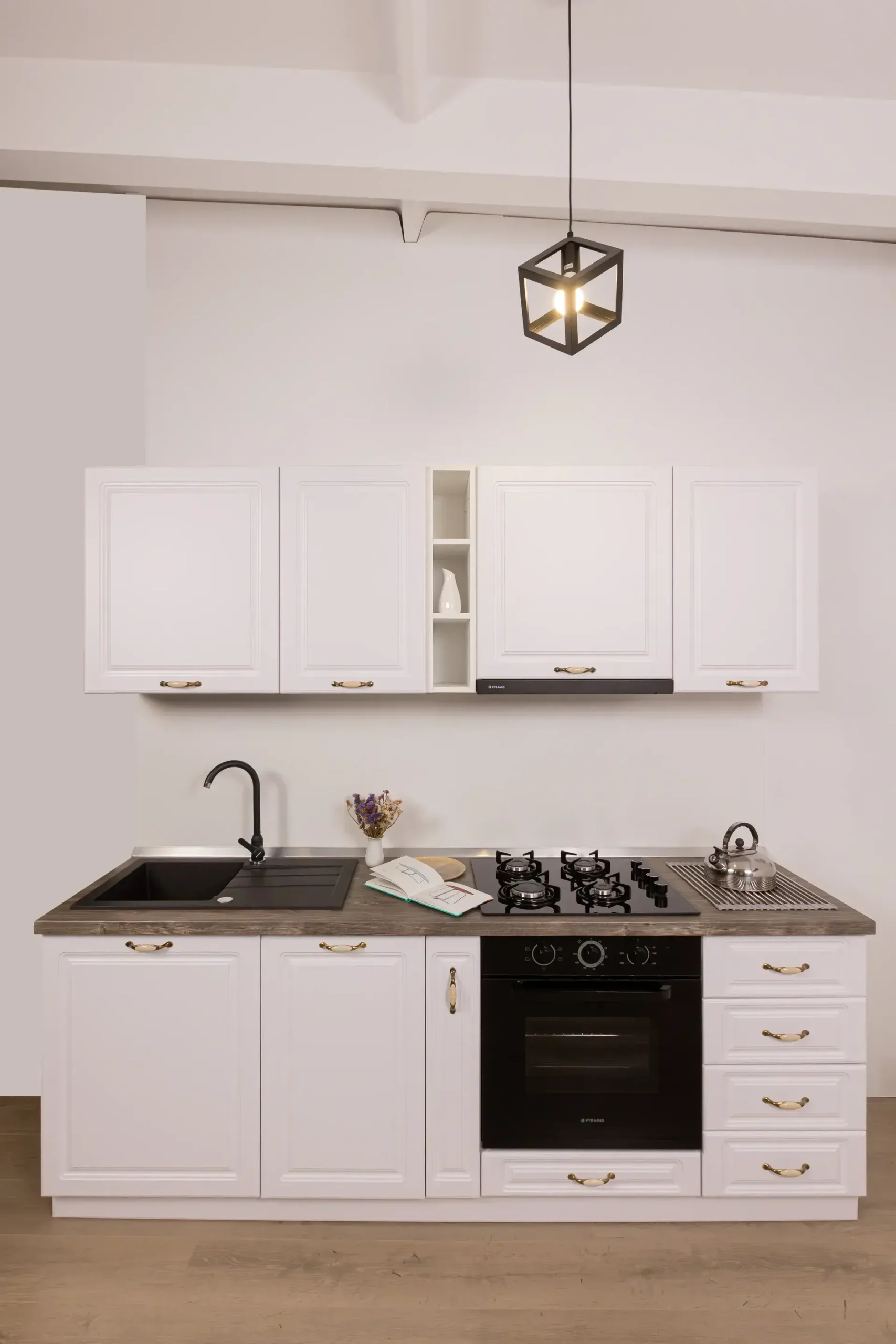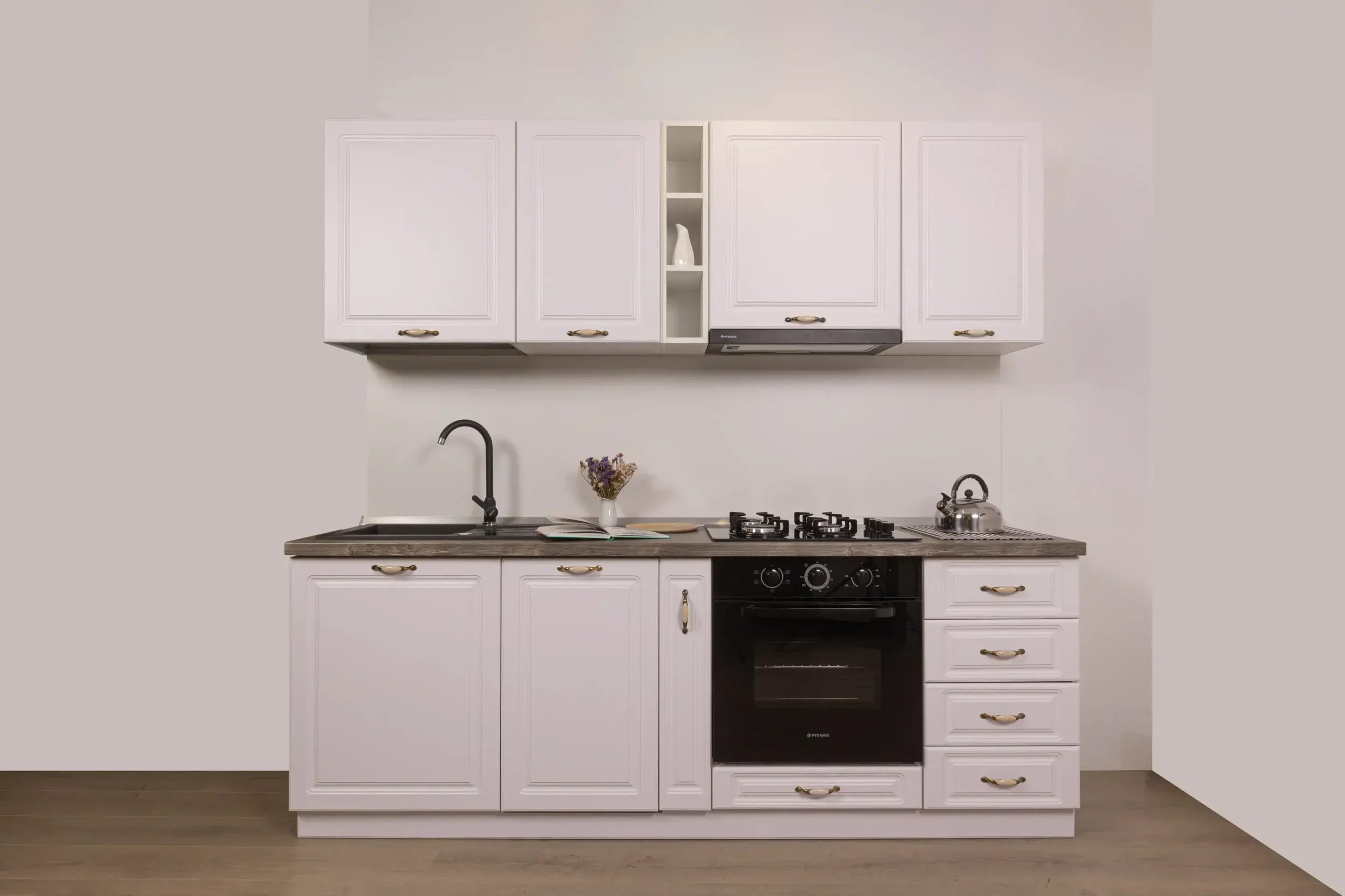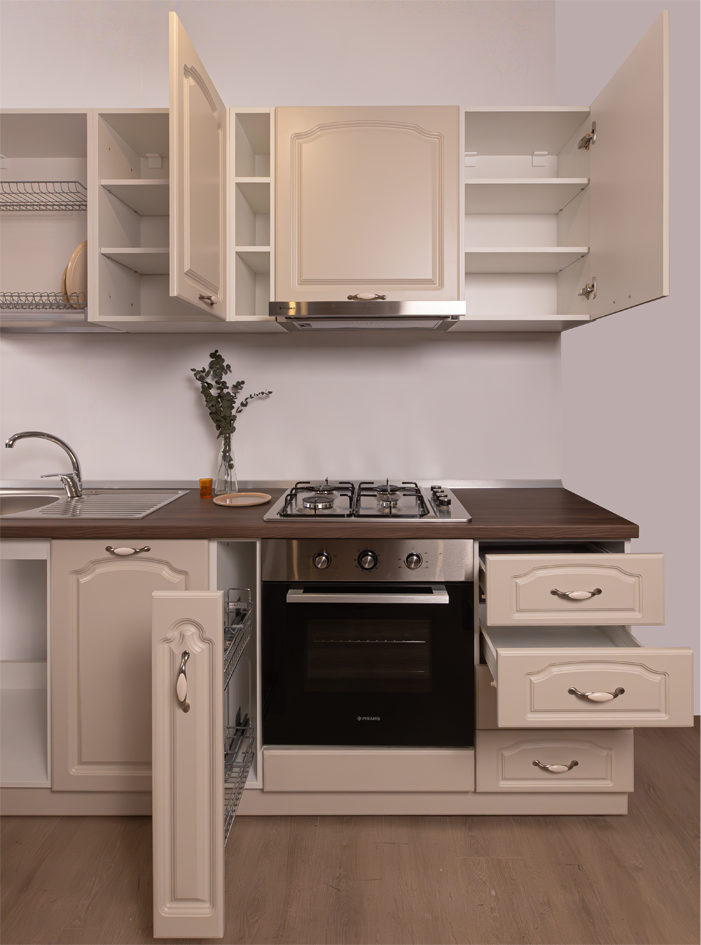 Setul de bucătărie Compact 1 îmbină farmecul atemporal al stilului clasic cu funcționalitatea modernă. Cu fronturi alb mat finisate cu frezări decorative și mânere vintage cu inserții ceramice, această bucătărie devine instantaneu inima casei tale.