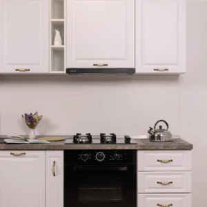 Setul de bucătărie Compact 1 îmbină farmecul atemporal al stilului clasic cu funcționalitatea modernă. Cu fronturi alb mat finisate cu frezări decorative și mânere vintage cu inserții ceramice, această bucătărie devine instantaneu inima casei tale.